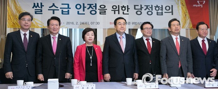 (서울=포커스뉴스) 24일 오전 서울 여의도 국회 귀빈식당에서 열린 쌀 수급 안정을 위한 당정협의에 앞서 새누리당 의원들과 정부부처 참석자들이 취재진을 향해 포즈를 취하고 있다. 왼쪽부터 송언석 기획재정부 2차관, 홍문표, 윤명희 의원, 김정훈 정책위의장, 이동필 농림축산식품부 장관, 안효대, 이종배 의원.