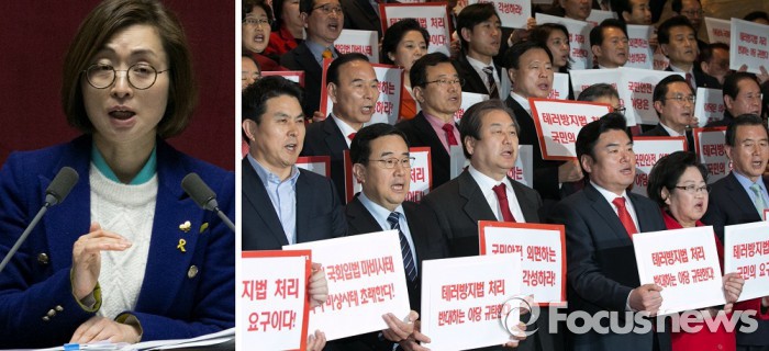 원유철 원내대표는 "지금이라도 국민의 안전을 정쟁의 대상으로 삼지 말고 즉각 필리버스터를 중단하라"며 "19대 국회가 최악의 국회라는 오명을 남기지 않았으면 좋겠다"고 목소리를 높였다.직권상정된 테러방지법의 국회 본회의 의결을 막기 위한 야당의 무제한 토론(필리버스터)가 밤새 이어지고 있다. 3번째 토론자로 나서 발언 중인 더불어민주당 은수미 의원. 한편 김무성(앞줄 왼쪽 세번째) 새누리당 대표와 원유철(앞줄 오른쪽 세번째) 원내대표를 비롯한 의원들이 23일 오후 서울 여의도 국회 로텐더홀에서 규탄성명을 발표했다.2016.02.24 박철중 기자