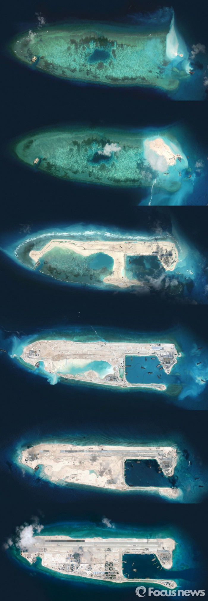 매체는 또 "왕 부장이 미 국방부를 방문하기로 예정돼있었지만 취소됐다"며 "어느 쪽이 방문을 취소했는지 명확하지 않다"고 전했다. 이에 대해 미 국방부 대변인은 "일정이 꼬였다"고 답했다.(서울= 포커스뉴스) 남중국해 중국 인공섬 건설을 둘러싸고 미-중간 실력대결이 고조되고 있다. 미국 상업위성 디지털글로브에서 포착한 중국의 인공섬과정을 차례로 모아봤다. 위로부터 2014년8월, 2014년 9월,2014년12월,2015년3월,2015년5월,2015년9월 위성사진. (사진제공 =디지털글로브)2015.10.29 포커스뉴스