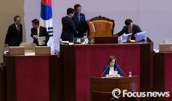 (서울=포커스뉴스) 24일 오전 서울 여의도 국회에서 은수미 더불어민주당 의원이 테러방지법과 관련해 무제한 토론을 이어가고 있다. 정갑윤 국회부의장과 이석현 국회부의장이 의장석을 교대하고 있다.