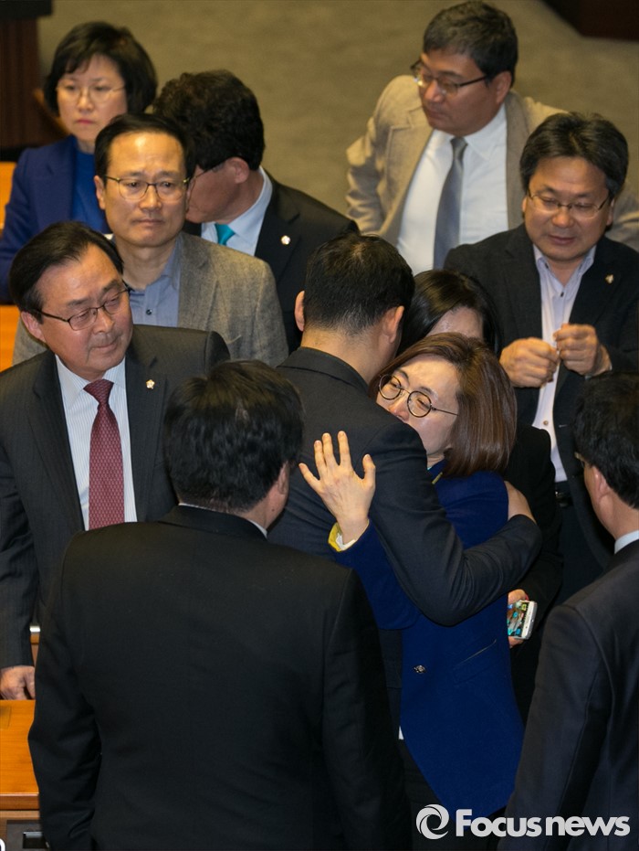 (서울=포커스뉴스) 테러방지법 직권상정에 반발해 야당의 무제한 토론(필리버스터)이 진행되고 있는 24일 오후 서울 여의도 국회 본회의장에서 토론을 마친 은수미 더불어민주당 의원이 동료 의원들의 격려를 받고 있다.