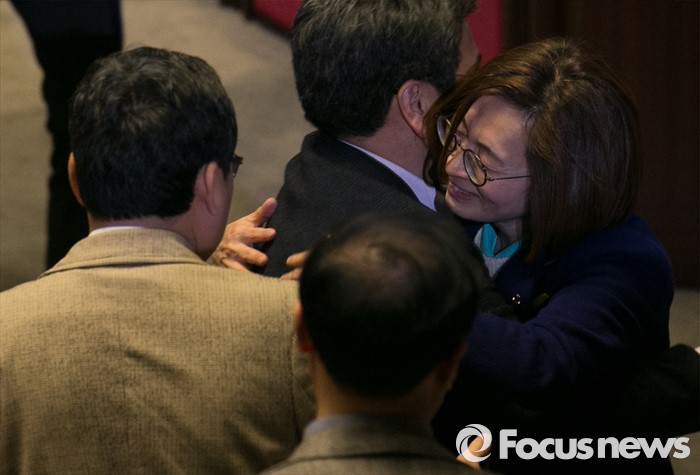 (서울=포커스뉴스) 테러방지법 직권상정에 반발해 야당의 무제한 토론(필리버스터)이 진행되고 있는 24일 오후 서울 여의도 국회 본회의장에서 토론을 마친 은수미 더불어민주당 의원이 동료 의원들의 격려를 받고 있다.