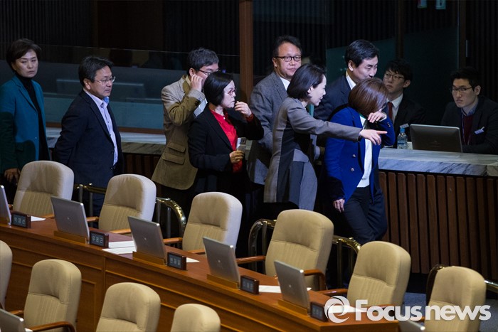 (서울=포커스뉴스) 테러방지법 직권상정에 반발해 야당의 무제한 토론(필리버스터)이 진행되고 있는 24일 오후 서울 여의도 국회 본회의장에서 토론을 마친 은수미 더불어민주당 의원이 동료 의원들의 격려를 받으며 퇴장하고 있다. 은 의원은 이날 10시간 18분의 토론을 기록해 국내 최장기록인 10시간 15분을 경신했다.