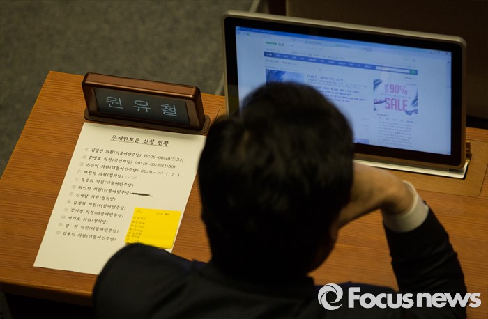 (서울=포커스뉴스) 박원석 정의당 의원이 24일 오후 서울 여의도 국회 본회의장에서 테러방지법의 본회의 의결을 막기 위한 필리버스터(무제한 토론을 통한 합법적 의사진행 방해)를 하고 있는 가운데 원유철(오른쪽) 새누리당 원내대표가 본인의 책상 앞에 '무제한 토론(필리버스터) 신청 현황'지를 두고 지루하게 앉아 있다.