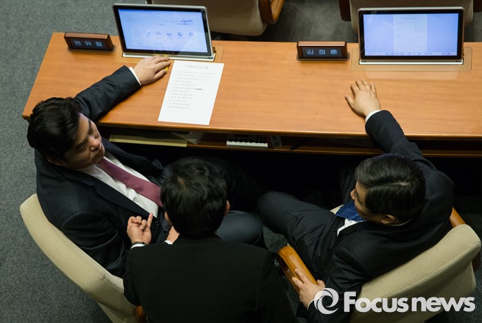 (서울=포커스뉴스) 박원석 정의당 의원이 24일 오후 서울 여의도 국회 본회의장에서 테러방지법의 본회의 의결을 막기 위한 필리버스터(무제한 토론을 통한 합법적 의사진행 방해)를 하고 있는 가운데 원유철(왼쪽) 새누리당 원내대표와 이종걸 더불어민주당 원내대표가 대화를 나누고 있다.