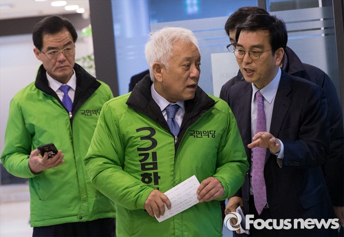 (서울=포커스뉴스) 국민의당 김한길(오른쪽 두번째) 상임공동선대위원장이 25일 오전 서울 마포 당사에서 열린 선거대책위원회 회의에 입장하고 있다.