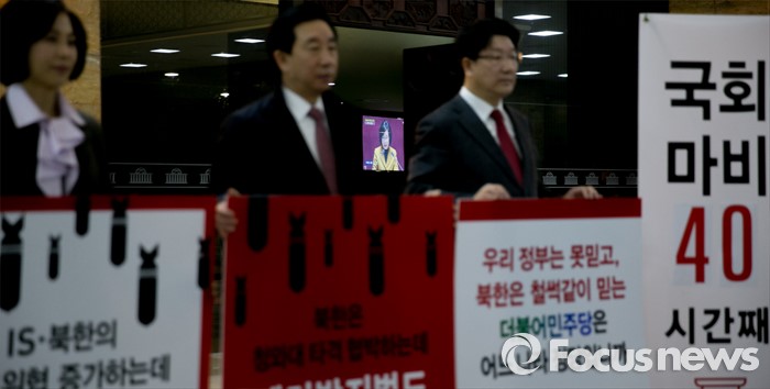 (서울=포커스뉴스) 테러방지법 직권상정에 반발해 야당의 무제한 토론(필리버스터)이 사흘째 진행되고 있는 25일 오전 서울 여의도 국회 본회의장 앞에서 신의진(왼쪽부터), 김성태, 권성동 새누리당 의원이 무제한 토론 비판 시위를 하고 있다.