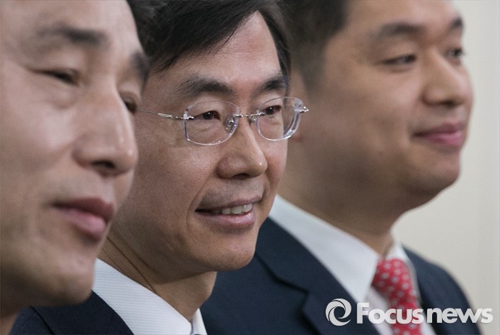 (서울=포커스뉴스) 25일 오전 서울 여의도 새누리당사에서 열린 20대 총선 공천 신청자 면접심사에 부산 사하을에 신청한 조경태 새누리당 의원과 예비후보들이 취재진 질문에 답하고 있다. 왼쪽부터 이호열, 조경태, 이용원 예비후보.