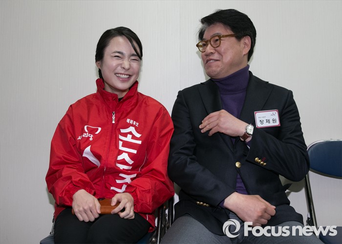 (서울=포커스뉴스) 25일 오전 서울 여의도 새누리당사에서 열린 20대 총선 공천 신청자 면접심사에 참석한 손수조(왼쪽), 장제원 부산 사상구 예비후보가 면접을 기다리며 대화하고 있다.