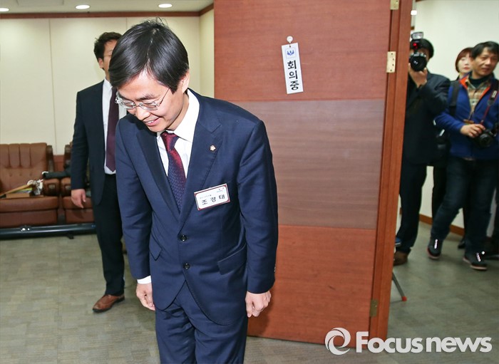 (서울=포커스뉴스) 25일 오전 서울 여의도 새누리당사에서 열린 20대 총선 공천 신청자 면접심사에 부산 사하을에 신청한 조경태 의원이 인사하고 있다.