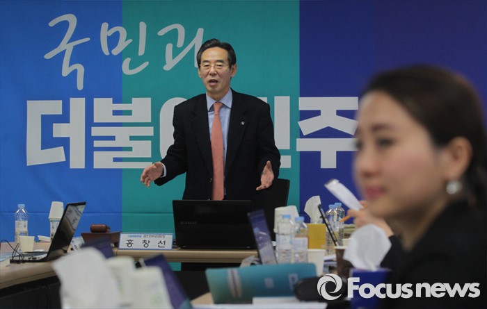 (서울=포커스뉴스) 25일 오전 서울 여의도 더불어민주당사에서 열린 20대 총선 공천 신청자 면접심사에 참석한 홍창선 공천관리위원장 등 위원들이 박영순, 고재일, 정현태 대전 대덕 예비후보에 대한 심사를 하고 있다.