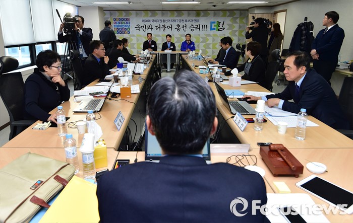 (서울=포커스뉴스) 25일 오전 서울 여의도 더불어민주당사에서 열린 20대 총선 공천 신청자 면접심사에 참석한 박영순, 고재일, 정현태 대전 대덕 예비후보가 홍창선 공천관리위원장 질의에 답하고 있다.
