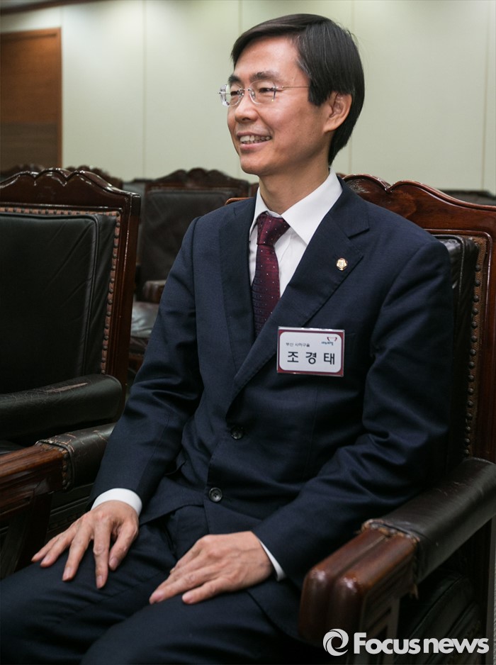(서울=포커스뉴스) 25일 오전 서울 여의도 새누리당사에서 열린 20대 총선 공천 신청자 면접심사에 부산 사하을에 신청한 조경태 의원이 공관위원들의 질문에 답하고 있다.