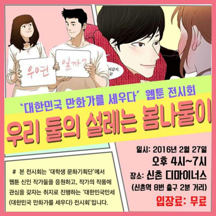 전시를 주최한 대학생 문화기획단은 "아마추어 웹툰 작가들의 창작을 응원하고 이들이 겪는 어려움에 대한 관심을 환기시키기 위해 기획했다"고 의미를 설명했다. 관람료는 무료다.웹툰 전시회 '대한민국 만화가를 세우다' 포스터.<사진제공=대학생 문화기획단>