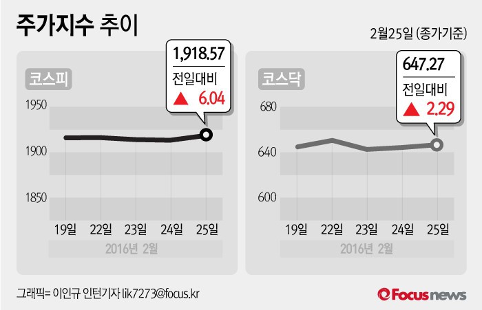 (서울=포커스뉴스) 25일 코스피지수는 전날 보다 0.32%(6.04포인트) 오른 1918.57에 장을 마쳤다. 코스닥지수는 전일 대비 0.36%(2.29포인트) 오른 646.27에 마감했다.