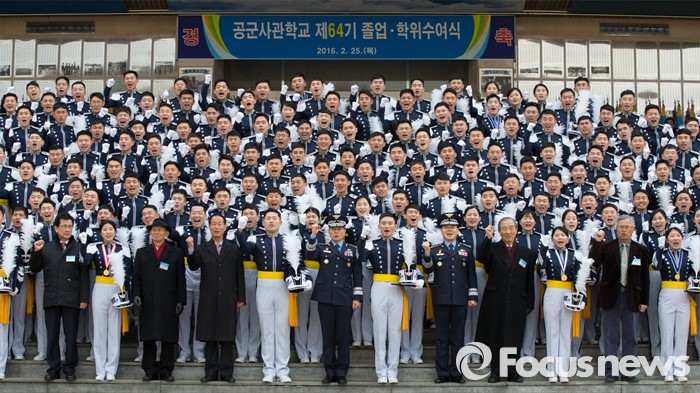 (청주=포커스뉴스) 25일 오후 충북 청주시 공군사관학교 연병장에서 열린 제64기 공군사관학교 졸업식에서 졸업생도들이 파이팅을 하며 기념촬영 하고 있다.