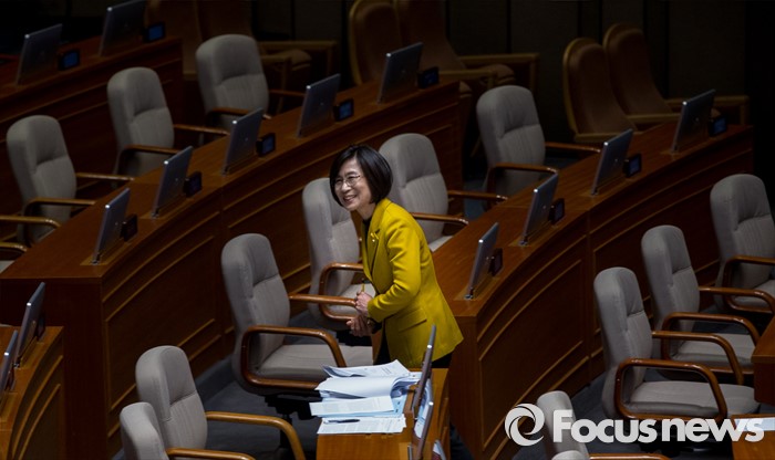 (서울=포커스뉴스) 테러방지법 직권상정에 반발해 야당의 무제한 토론(필리버스터)이 사흘째 진행되고 있는 25일 오후 서울 영등포구 국회 본회의장에서 김제남 정의당 의원이 발언을 마친 뒤 환하게 웃으며 본회의장을 나서고 있다.