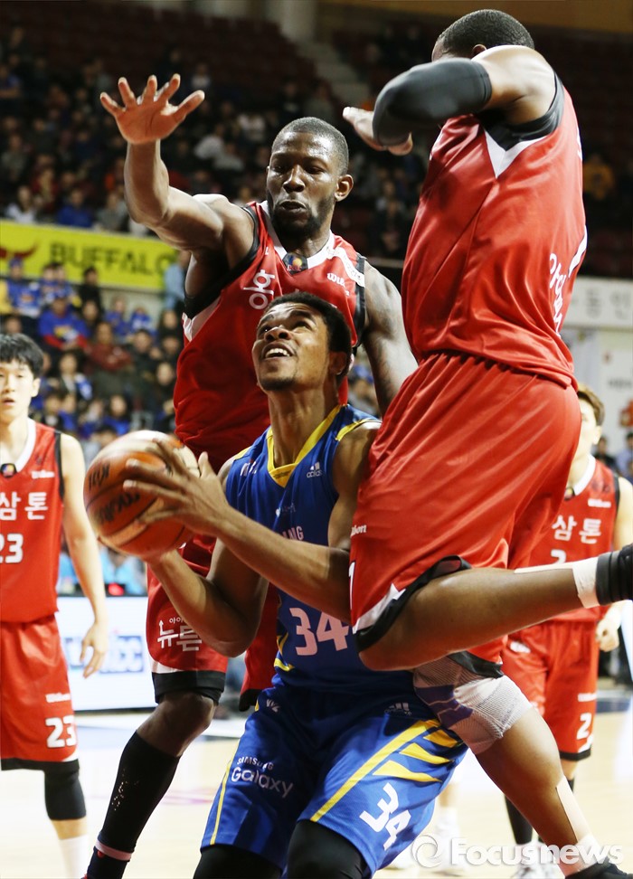 (안양=포커스뉴스) 25일 안양실내체육관에서 열린 2015-2016 프로농구 6강 플레이오프 KGC-삼성 1차전에서 KGC 마리오 리틀과 찰스 로드가 삼성 에릭 와이즈의 골밑슛을 막고 있다.