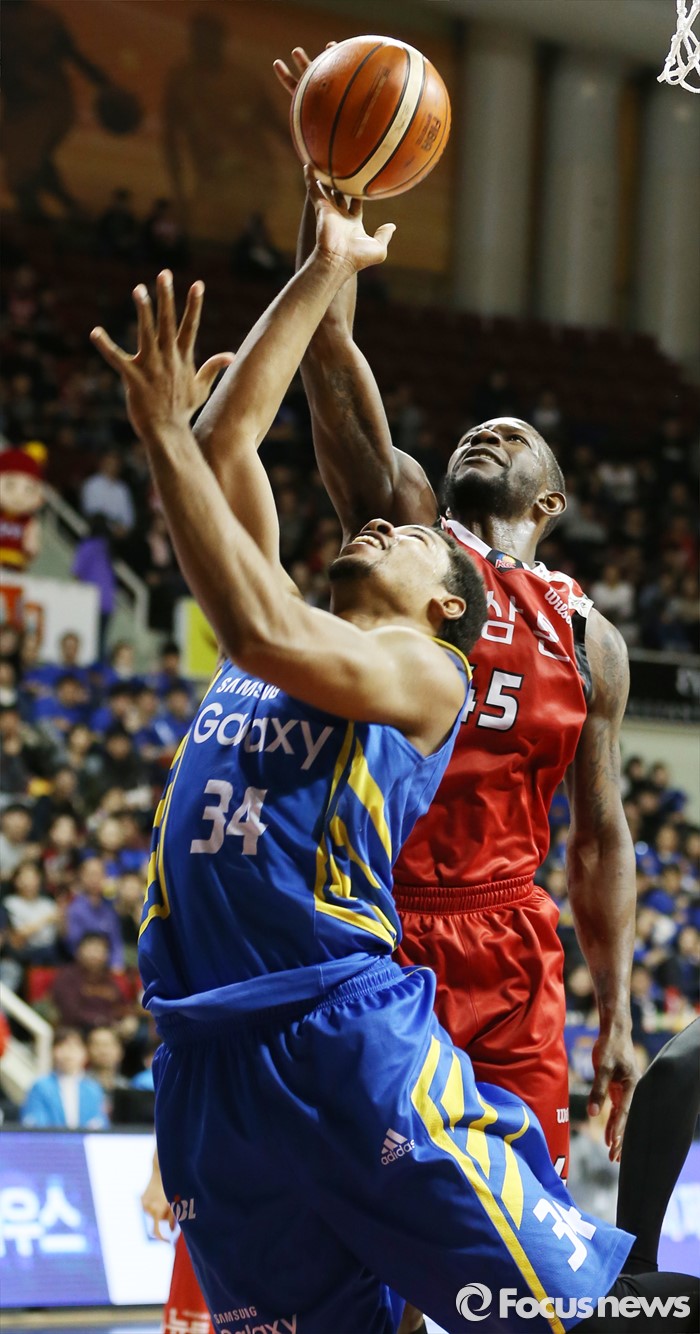 (안양=포커스뉴스) 25일 안양실내체육관에서 열린 2015-2016 프로농구 6강 플레이오프 KGC-삼성 1차전에서 KGC 마리오 리틀이 삼성 에릭 와이즈의 골밑슛을 뒤에서 쳐내고 있다.