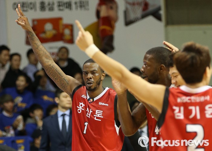 (안양=포커스뉴스) 25일 안양실내체육관에서 열린 2015-2016 프로농구 6강 플레이오프 KGC-삼성 1차전에서 KGC 마리오 리틀이 3점슛을 성공시키자 찰스 로드가 손가락 3개를 치켜들며 기뻐하고 있다.