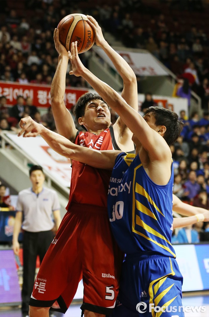 (안양=포커스뉴스) 25일 안양실내체육관에서 열린 2015-2016 프로농구 6강 플레이오프 KGC-삼성 1차전에서 KGC 문성곤이 삼성 장민국의 수비를 제치며 슈팅을 시도하고 있다.