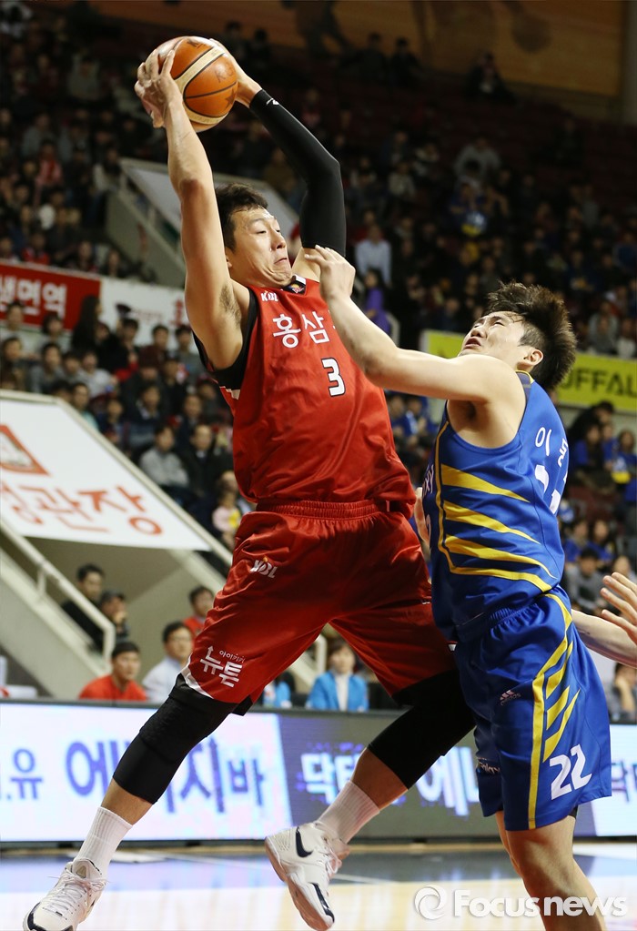 (안양=포커스뉴스) 25일 안양실내체육관에서 열린 2015-2016 프로농구 6강 플레이오프 KGC-삼성 1차전에서 KGC 이정현이 삼성 이동엽에 앞서 리바운드볼을 잡고 있다.