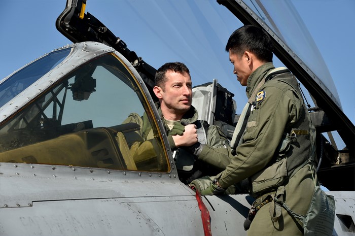(서울=포커스뉴스) 지난 24일 경기도 평택시 주한미군 오산공군기지에서 열린 쌍매훈련에 앞서 미 공군의 A-10 공격기에서 한·미 공군 조종사들이 완벽한 연합작전 임무수행을 다짐하며 손을 맞잡고 있다. <사진제공=공군>