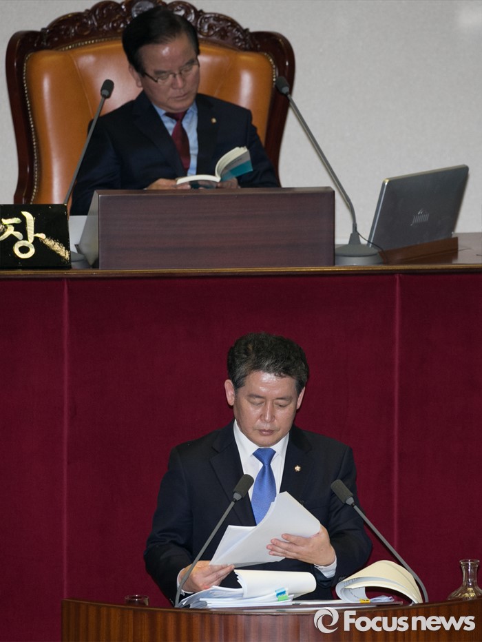 (서울=포커스뉴스) 테러방지법 직권상정에 반발해 야당의 무제한 토론(필리버스터)이 나흘째 진행되고 있는 26일 오전 서울 여의도 국회 본회의장에서 토론에 참여한 김경협 더불어민주당 의원이 발언하고 있다.