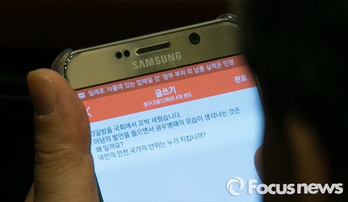 (서울=포커스뉴스) 테러방지법 직권상정에 반발해 야당의 무제한 토론(필리버스터)이 나흘째 진행되고 있는 26일 오전 서울 여의도 국회 본회의장에서 조원진 새누리당 원내수석부대표가 자신의 친목모임 SNS에 글을 남기고 있다.