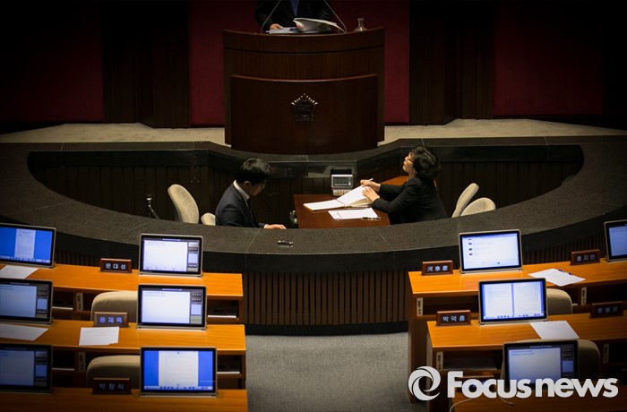 (서울=포커스뉴스) 테러방지법 직권상정에 반발해 야당의 무제한 토론(필리버스터)이 나흘째 진행되고 있는 26일 오전 서울 여의도 국회 본회의장에서 의원들의 발언을 기록하는 속기사들이 근무를 이어가고 있다.