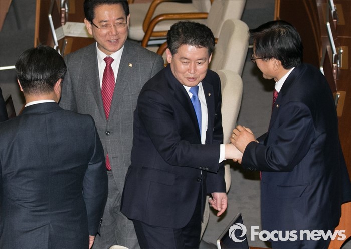 (서울=포커스뉴스) 테러방지법 직권상정에 반발해 야당의 무제한 토론(필리버스터)이 나흘째 진행되고 있는 26일 오전 서울 여의도 국회 본회의장에서 김경협 더불어민주당 의원이 토론을 마친 뒤 동료 의원들로부터 격려받고 있다.