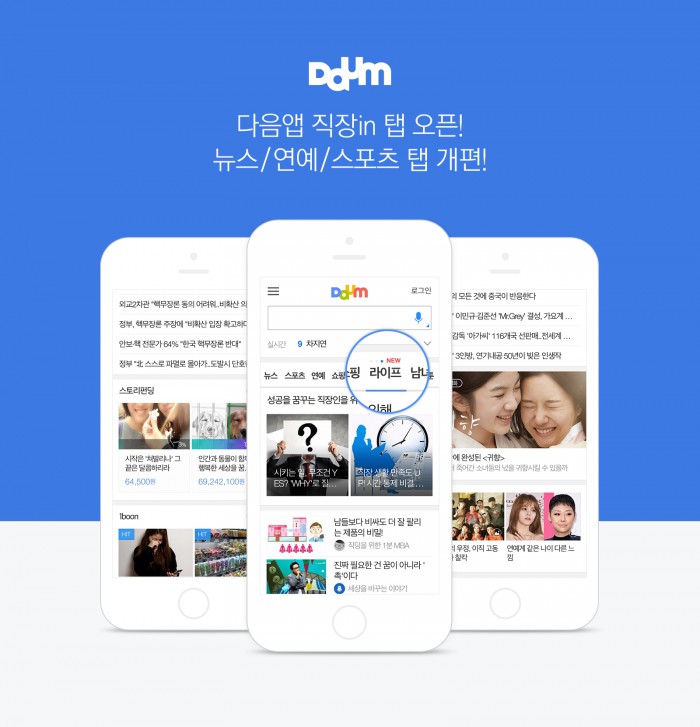 (서울=포커스뉴스) 카카오(대표 임지훈)는 다음앱 및 다음 모바일 첫 화면에 직장인 및 취업준비생을 위한 '직장in'탭을 신설하고 뉴스, 스포츠, 연예 탭을 개편해 뉴스 다양성을 강화했다고 26일 밝혔다