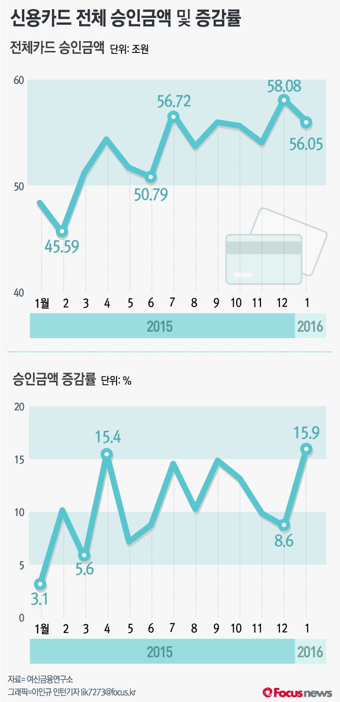 (서울=포커스뉴스) 26일 여신금융연구소가 발표한 '2016년 1월 카드승인실적 분석'을 보면 지난달 전체카드 승인금액은 56조5000만원으로 승인금액이 전년 동월 대비 15.9% 증가한 것으로 나타났다.