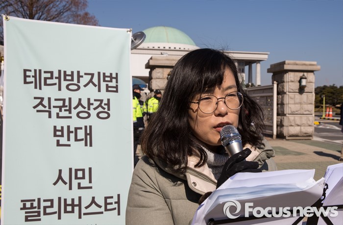 (서울=포커스뉴스) 26일 오전 서울 여의도 국회 정문 앞에서 김지미 민변 변호사가 테러방지법 직권상정 반대 시민 필리버스터를 이어가고 있다.