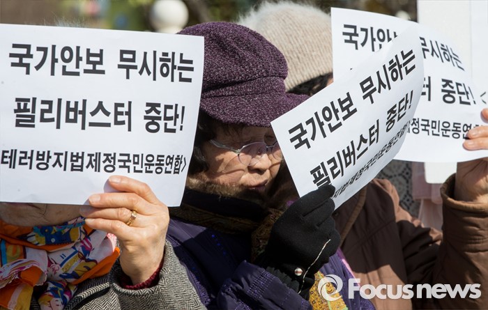(서울=포커스뉴스) 26일 오전 서울 여의도 국회 정문 앞에서 보수단체 회원들이 테러방지법 제정을 요구하는 손팻말을 들고 있다.