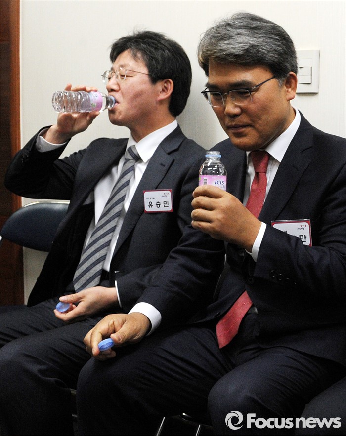 (서울=포커스뉴스) 26일 오전 서울 여의도 새누리당사에서 열린 20대 총선 공천 신청자 면접심사에 참석한 유승민(왼쪽), 이재만 대구 동구을 예비후보가 면접을 기다리며 물을 마시고 있다.