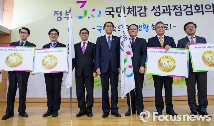 (서울=포커스뉴스) 26일 오후 서울 중구 정부서울청사 별관에서 열린 '2016년 제1회 정부3.0 국민체감 성과점검회의'에 참석한 김성렬(가운데) 행정자치부 차관이 우수기관 수상자들과 기념촬영을 갖고 있다.
