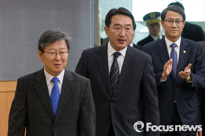 (서울=포커스뉴스) 26일 오후 서울 중구 정부서울청사 별관에서 열린 '2016년 제1회 정부3.0 국민체감 성과점검회의'에 송희준(왼쪽부터) 정부3.0추진위원장, 현기환 정무수석, 김성렬 행정자치부 차관이 입장하고 있다.