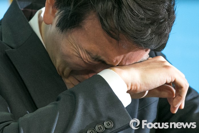 (서울=포커스뉴스) 서기호 정의당 의원이 26일 오후 서울 여의도 국회 정론관에서 총선 불출마 선언을 하며 눈물 흘리고 있다.