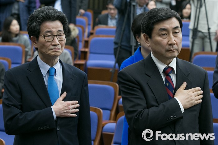 (서울=포커스뉴스) 이종걸(오른쪽) 더불어민주당 원내대표와 이목희 정책위의장이 26일 오후 서울 여의도 국회에서 열린 의원총회에 참석해 국민의례를 하고 있다.