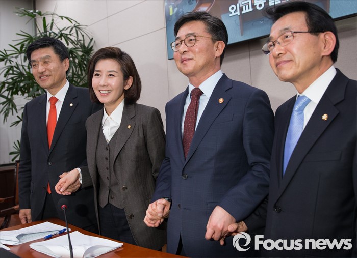 (서울=포커스뉴스) 나경원 외통위원장과 홍용표 통일부 장관을 비롯한 여당, 야당 간사가 26일 오후 서울 여의도 외교통일위원회 전체회의에서 박근혜 정부의 국정 핵심 법안 중 하나인 북한 인권법을 의결한 뒤 손을 잡고 포토타임을 갖고 있다. 왼쪽부터 심윤조 여당 간사, 나경원 외통위원장, 홍용표 통일부 장관, 심재권 야당 간사.