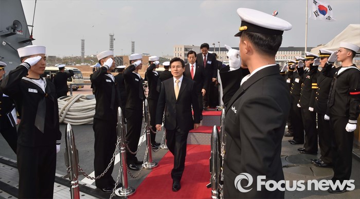 (서울=포커스뉴스) 황교안 국무총리가 26일 오후 제주 서귀포 제주해군기지에서 열린 제주민군복합형관광미항 준공식에 참석해 이지스구축함 서애류성룡함에 승선하고 있다. <사진제공=해군>