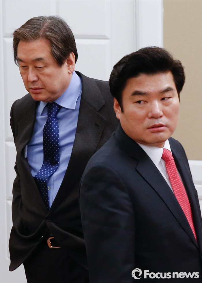 (서울=포커스뉴스) 테러방지법 직권상정에 반발해 야당이 무제한 토론(필리버스터)를 나흘째 진행하고 있는 26일 오후 서울 여의도 국회 귀빈식당에서 선거구 획정 및 쟁점법안 논의를 위해 열린 여야 지도부 회동에 참석한 김무성(왼쪽) 새누리당 대표와 원유철 원내대표가 굳은 표정을 짓고 있다.