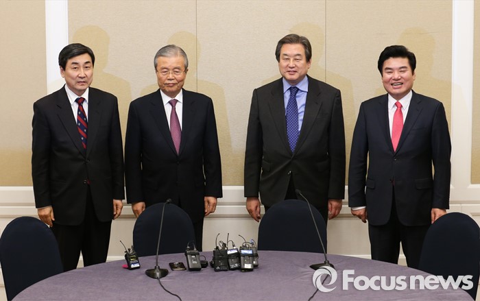 (서울=포커스뉴스) 테러방지법 직권상정에 반발해 야당이 무제한 토론(필리버스터)를 나흘째 진행하고 있는 26일 오후 서울 여의도 국회 귀빈식당에서 선거구 획정 및 쟁점법안 논의를 위한 여야 지도부 회동에 앞서 참석자들이 취재진을 향해 포즈를 취하고 있다. 왼쪽부터 이종걸 더불어민주당 원내대표, 김종인 비대위 대표, 김무성 새누리당 대표, 원유철 원내대표.