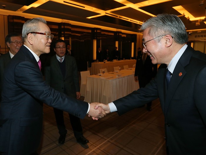 (서울=포커스뉴스) 김종덕(오른쪽) 문화체육관광부 장관이 26일 서울 중구 조선호텔에서 '호텔업계 간담회'에 앞서 참석자들과 인사를 나누고 있다. <사진제공=문화체육관광부>