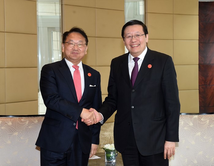 (서울=포커스뉴스) G20재무장관.중앙은행총재회의 참석차 중국 상해를 방문중인 유일호 부총리 겸 기획재정부 장관이 2월 27일 푸동 상글리라 호텔에서 러우 지웨이 중국 재무장관과 면담에 앞서 악수를 하고 있다. <사진제공=기획재정부>