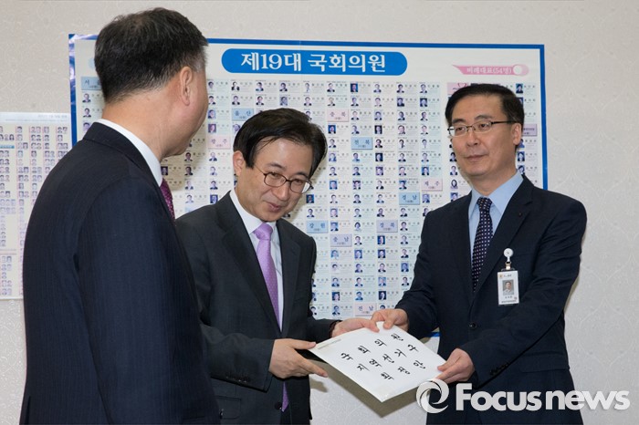 (서울=포커스뉴스) 김세환(오른쪽) 선거구획정위원횐 사무국장이 28일 오전 서울 여의도 국회의장실을 방문해 이명우 정무수석 비서관에게 국회의원 지역선거구 획정안을 전달하고 있다.
