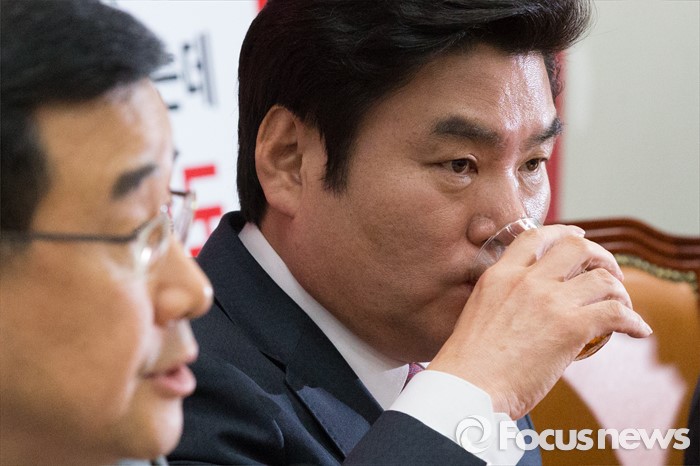 (서울=포커스뉴스) 28일 오후 서울 여의도 국회에서 열린 국회정상화 촉구 특별기자회견에서 원유철 새누리당 원내대표가 물을 마시고 있다.