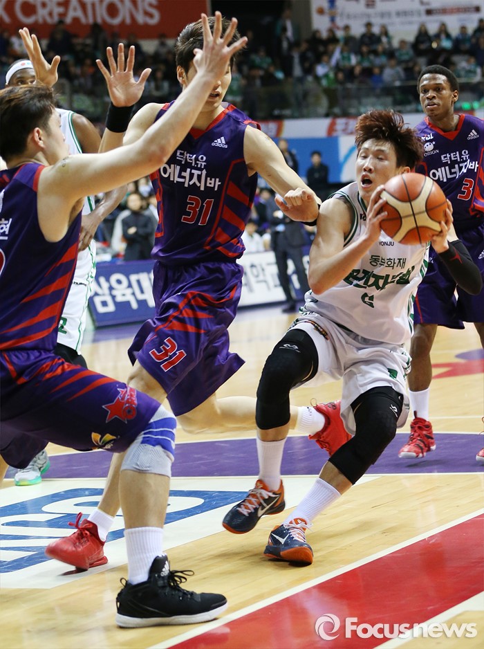 (고양=포커스뉴스) 28일 고양체육관에서 열린 2015-2016 프로농구 오리온-동부 6강 플레이오프 2차전에서 동부 두경민이 골밑을 향해 돌파를 시도하다 오리온이승현과 장재석의 수비 앛에서 멈추고 있다.