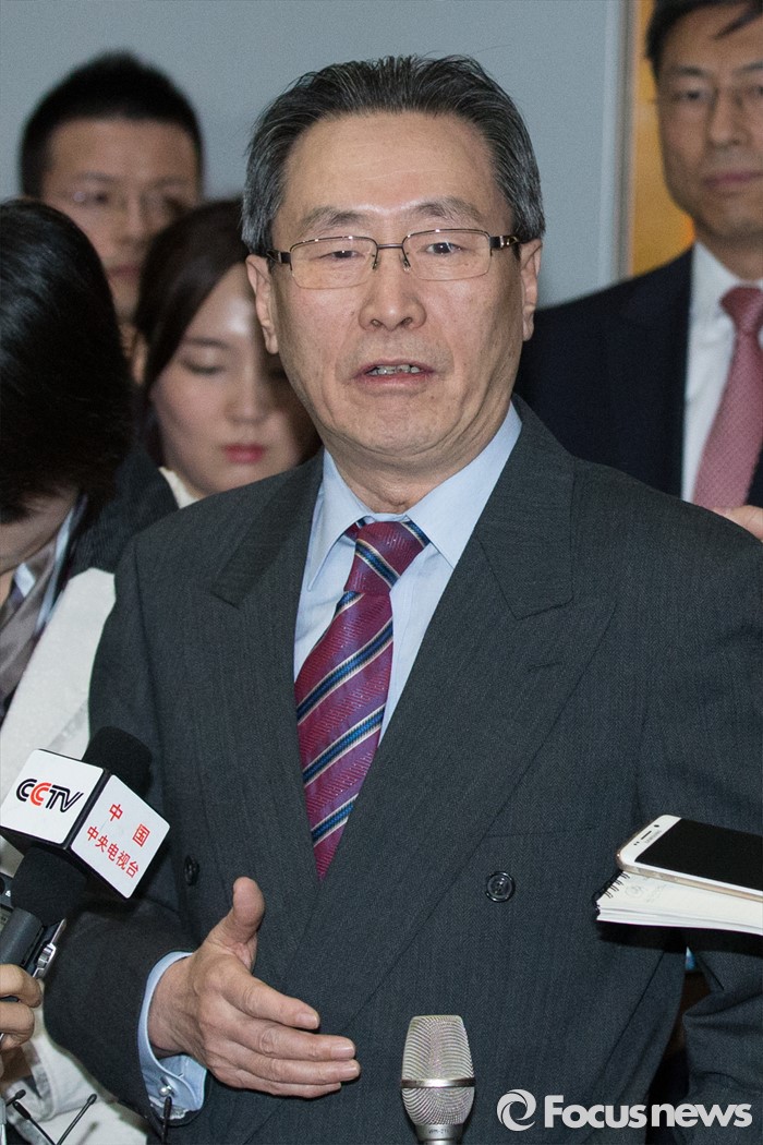 (서울=포커스뉴스) 중국 측 수석대표인 우다웨이 중국 외교부 한반도사무특별대표가 28일 오후 서울 종로구 외교부 청사에서 북핵 6자회담의 우리 측 수석대표인 황준국 외교부 한반도평화교섭본부장과의 면담을 끝내고, 취재진의 질문에 대답하고 있다.
